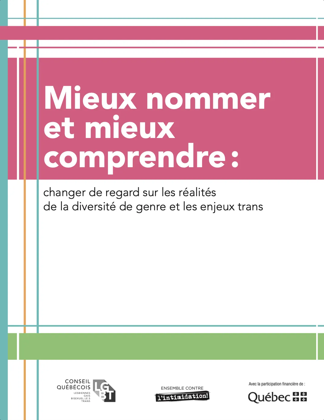 1 (855) 909-9038 , option 1Ce guide offre des outils pratiques aux médias et aux services de soutien de première ligne qui interagissent, directement ou indirectement, avec des personnes trans. Il vise non seulement à prévenir les situations problématiques et les propos maladroits, mais aussi à faciliter des interactions bienveillantes et respectueuses. Chaque section de ce guide aborde un enjeu spécifique à prendre en considération lorsqu’on s’intéresse aux réalités trans. Les conseils contenus dans chaque section s’appliquent à de nombreux cas de figure, de la recherche journalistique à l’accueil dans les services essentiels, en passant par les pratiques d’entrevue et les interactions quotidiennes en milieu de travail.